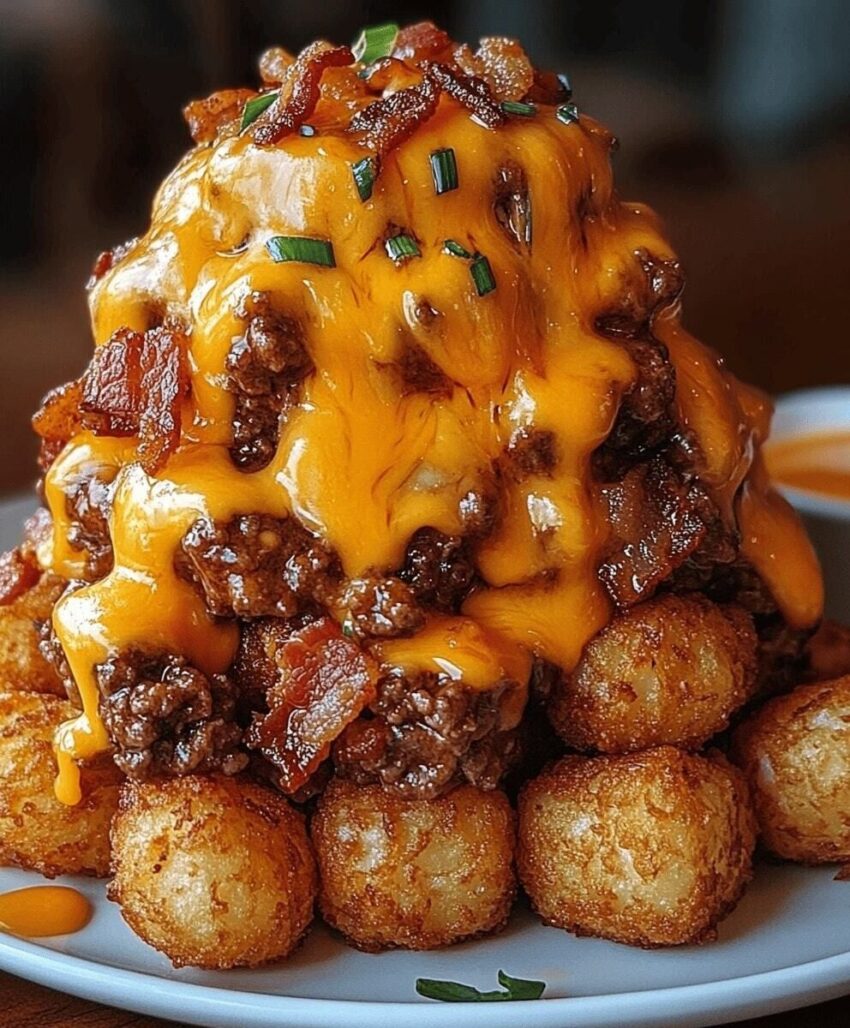 Here’s an over-the-top, indulgent Bacon Cheeseburger Stuffed Tater Tot Cones with a Colossal Cheese Volcano recipe. This is perfect for parties, game day, or when you’re just craving something wildly fun and cheesy.