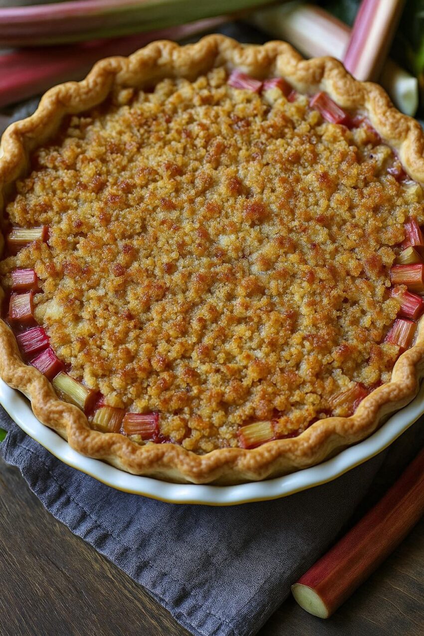 Sprinkle the crumb topping evenly over the rhubarb filling.