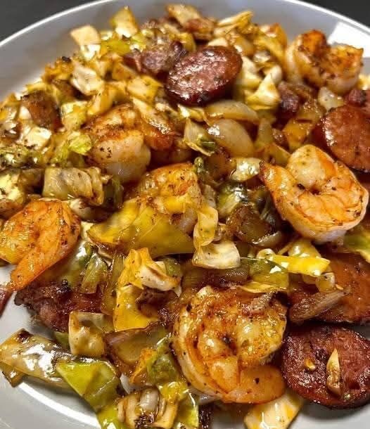 FRIED CABBAGE WITH SHRIMP, SAUSAGE & BACON